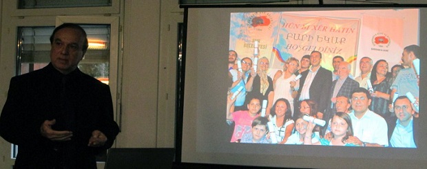 Պաստառի վրայ լուսանկարներու ցուցադրութեամբ, Րաֆֆի Պետրոսեան ներկայացուց իր նիւթը: Առաջին տպաւորութիւնը սկսած է ըմբշամարտի ախոյեան իր «թուրք» ուսուցչին «Ապրիս» բառի փսփսուքով, երբ ինք մարմնամարզի յաղթանակ մը նուաճած էր: Ապա մեծ մայրիկը յառաջացած տարիքին պատմած է, թէ ինչպէ՛ս գաղթի ճամբուն վրայ Պուրսայի մէջ թաղած է իր տասնօրեայ զաւակը: