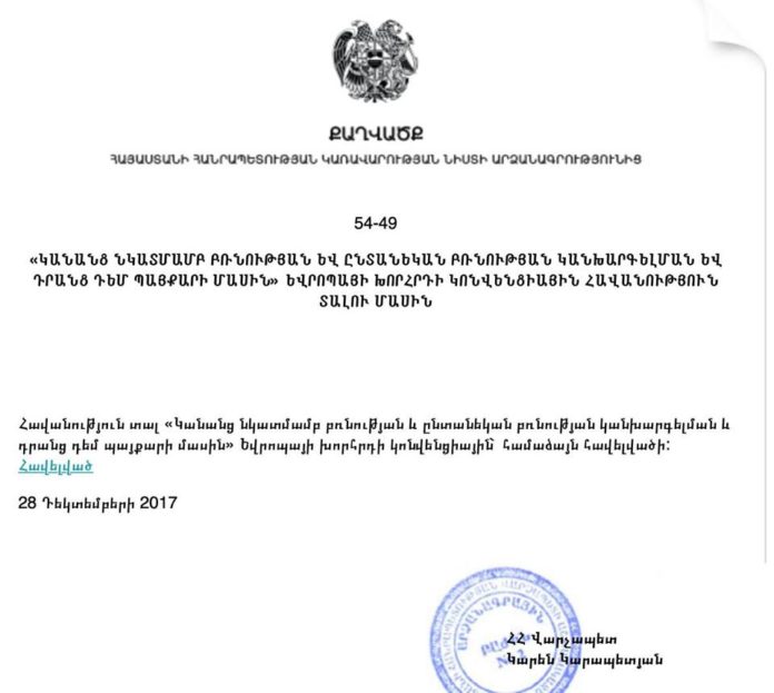 Ստամբուլյան կոնվենցիան ստորագրած ՀՀԿ-ն՝ ընդդեմ Ստամբուլյան կոնվենցիայի August 4, 2019 Lousavor Avedis Հայաստան 0 Post Views: 620 Ստամբուլյան կոնվենցիան ստորագրած ՀՀԿ-ն՝ ընդդեմ Ստամբուլյան կոնվենցիայի 28 ՅՈՒԼԻՍ 2019 – aniarc.am/2019/07/28/stambul-convention-2017-republican/?