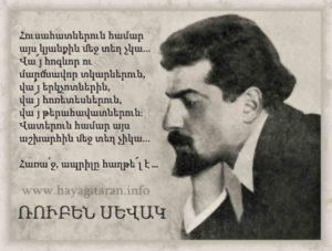 Բարի լոյս՝ բազմաչարչար մեր ժողովուրդին պարտադրուած անհուն եւ անվերջ ԱՐՀԱՒԻՐՔին դէմ ՀԱՅ ՄԱՐԴՈՒՆ ՑԱՍՈՒՄը անմահացուցած մեծ երգիչին՝ Ռուբէն Սեւակի (Չիլինկիրեան, 1885-1915) կանխահաս հանճարին առջեւ խոնարհելով։