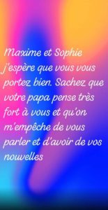 Sophie pleurait en novembre 2018 au téléphone pour que je revienne les chercher et Maxime ne peut plus dialoguer avec ses copains du collège de Lusigny sur Barse ( preuve qu’il n’est pas libre de ses mouvements).
