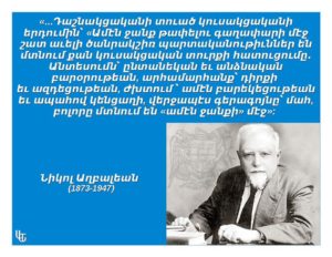 Դաշնակցականն իր անձին մէջ վերակազմում է նոր հայութեան տիպարը, բորբոքելով ժառանգական արութեան կայծերը, որ մնացած են անթեղուած եւ յարաճուն խիզախութեամբ խարանելով ու սպիացնելով ժառանգական ստրկութեան վէրքերը։
