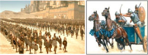 «….Եւ յանկարծ երկրի հիմքերը սկսան երերալ: Հեռու հիւսիսէն հարաւ կ՛արշաւէին անծանօթ դաժան ռազմիկներ, որոնց անհնար էր դիմադրել: Լուրեր կը շրջէին, զարմանալի կենդանիներու մասին, որոնց վրայ հեծած անոնք կը սլանային ահռելի արագութեամբ՝ սփռելով մահ ու աւեր: Բարձրահասակ էին, յաղթանդամ, փարթամ մօրուքներով: Հմուտ նետաձիգներ էին եւ ունէին երկար սուսերներ: …Եգիպտական արեւախանձ տափաստանին վրայ խիտ շարքերով կանգնած էին անհաշիւ փորձառու ռազմիկներ, որոնք կը սպասէին թշնամիին: Արեւին տակ փայլող անոնց սեւ մարմինները, միատեսակ զէնքերը, ստուար գունդերը՝ կազմուած սափրուած գլուխներով ջլապինդ զինուորներէ, հաւատ եւ վստահութիւն կը ներշնչէին, թէ՝ ո՛չ մէկ ուժ կրնար խորտակել անոնց շարքերը…