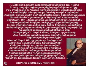 «Մինչդեռ Լօզանը ամբողջովին անտեսեց Հայ Դատը եւ հայ ժողովուրդի ազատ ինքնորոշման իրաւունքը։ Իսկ Մոսկուայի եւ Կարսի ղաշնագիրները միայն մասնակի եւ յամենայնի անարդար լուծում մը տուին Հայկական Հարցին, Հայաստանի սահմաններէն դուրս ձգելով բովանդակ Արեւմտեան Հայաստանը եւ Արեւելեան Հայաստանի մեծ մասը։ Այո՛, Հայաստանի սահմաններէն դուրս ձգեցին հայապատկան հողերու աւելի քան չորս հինգերորդը եւ հայ ժողովուրդի աւելի քան երկու երրորդը, ստեղծելով մանրանկար Հայաստան մը եւ իրաւազրկելով հայութիւնը իր ամէնէն արդար պահանջներուն մէջ։