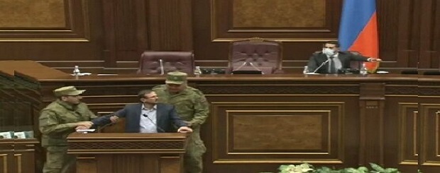 Անվտանգութեան աշխատակիցները ուժով հեռացուցին Գեղամ Մանուկեանը ամպիոնին մօտէն, որմէ ետք 20 վայրկեան դադար յայտարարուեցաւ: